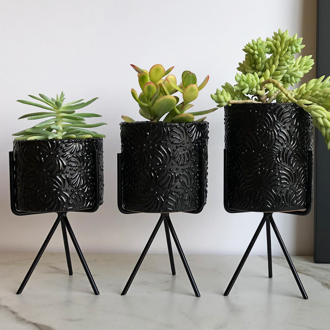 Set de 3 macetas en Color Negro, ideal para decorar el hogar con detalles únicos (incluye 3 tamaños: Ch, M y G) y bases de acero con pintura electrostática color negro.
