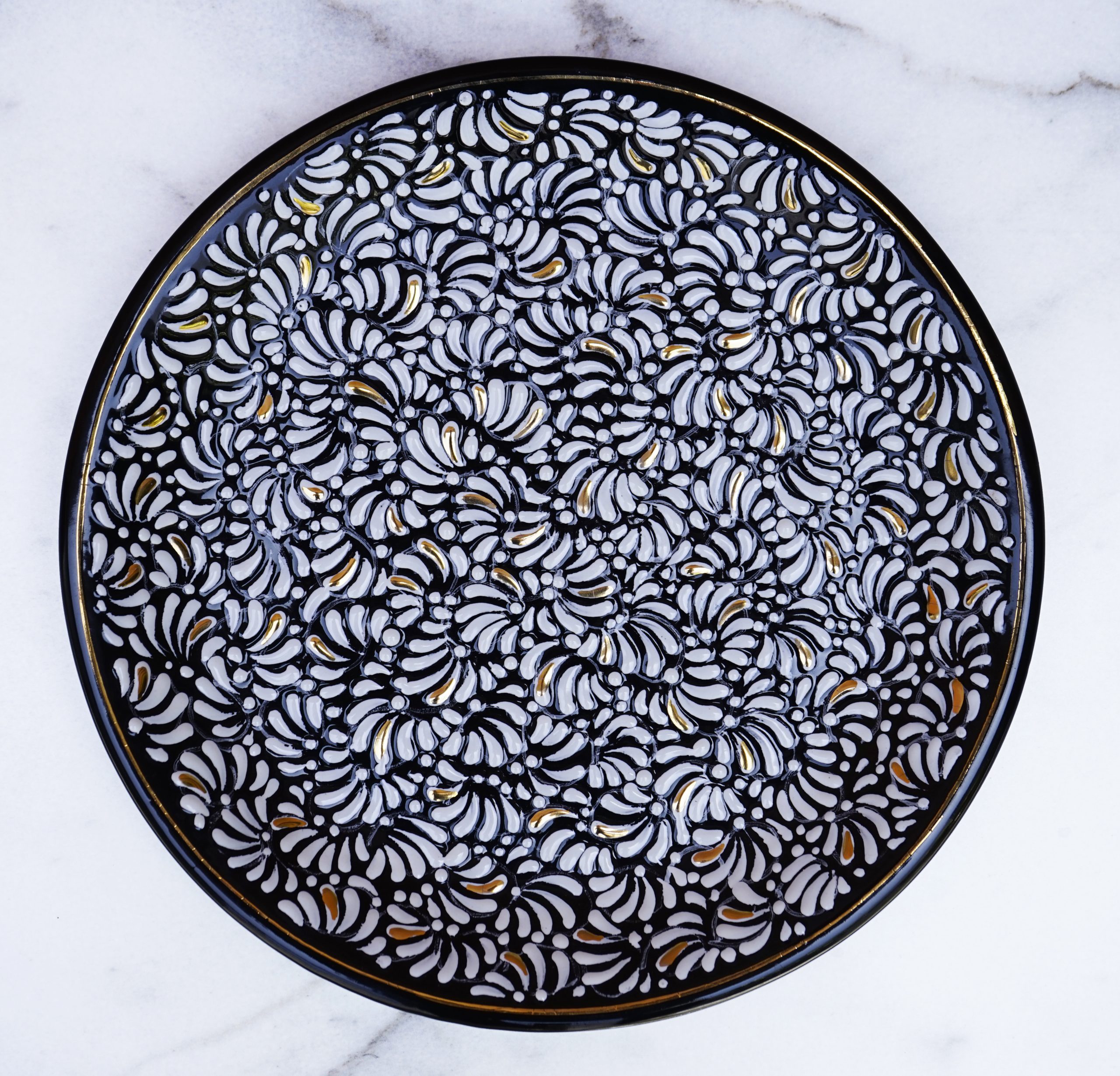 Plato negro brillante con decorado plumeado blanco brillante y aplicaciones de oro de 14K.